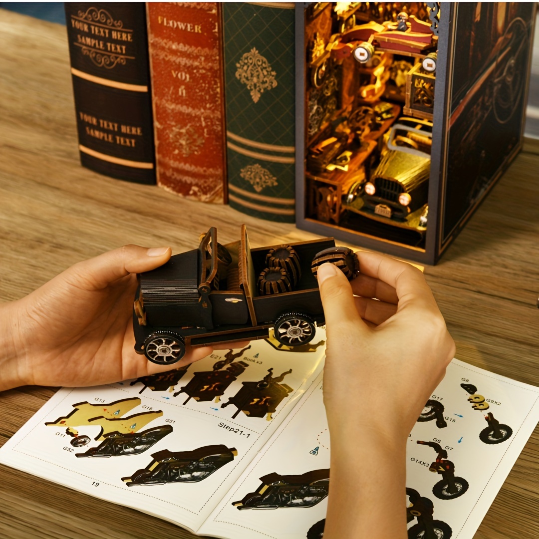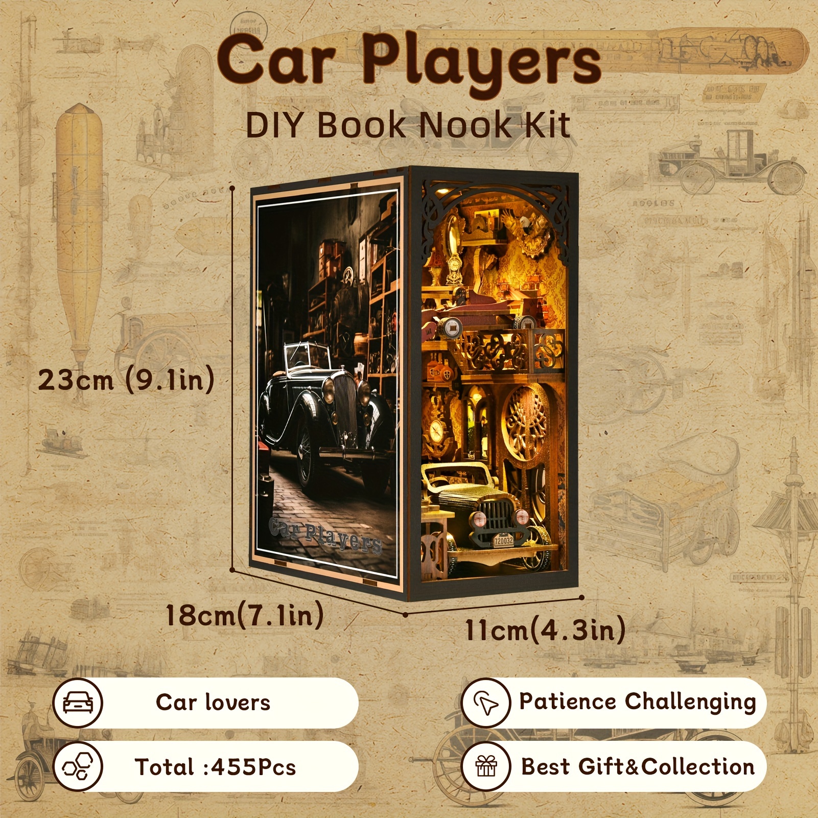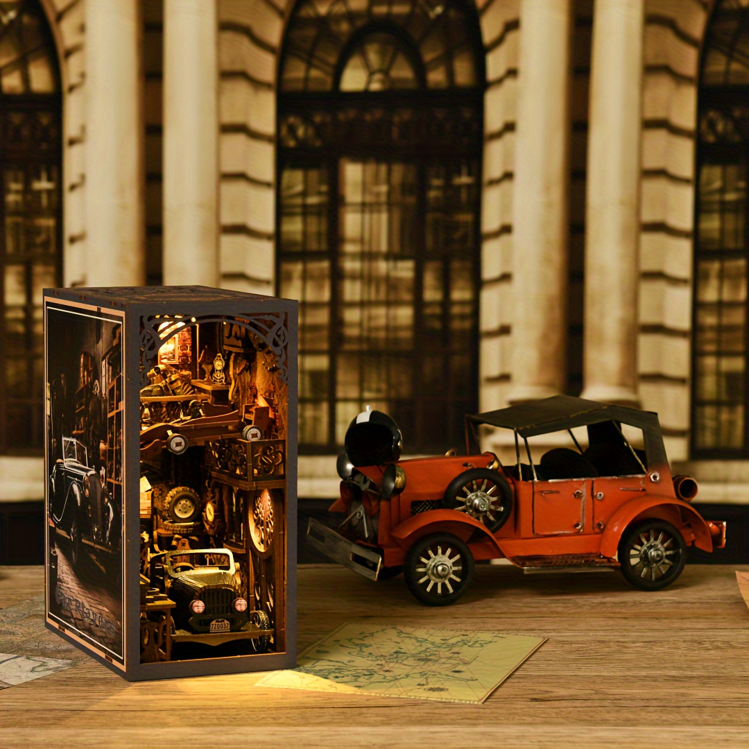 1pc DIY Book Nook Miniature Kit, the car players, 3D Wooden Puzzle Bookshelf Insert Decor Alley with LED, Vintage Bookend Model Building Creative Set, Birthday Gift, Home Room Decor (Without Battery)