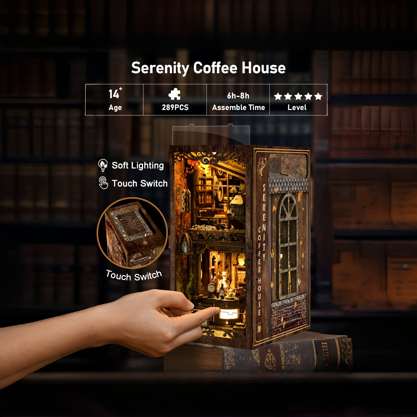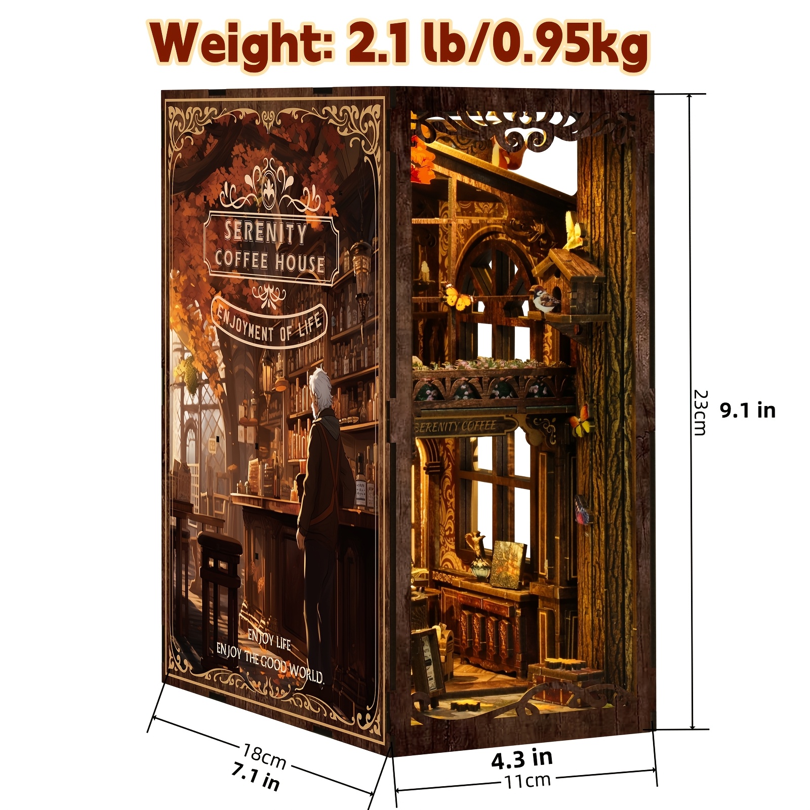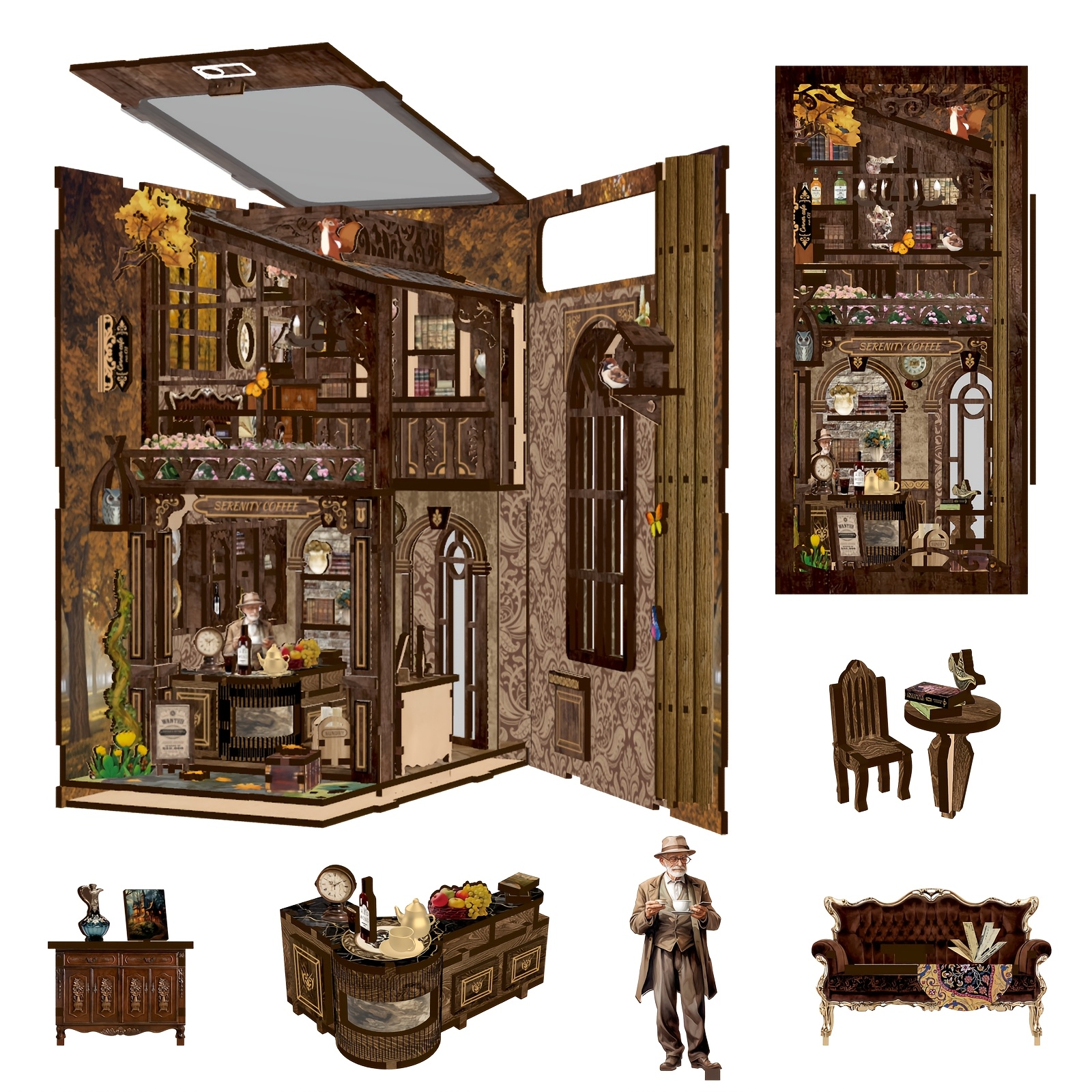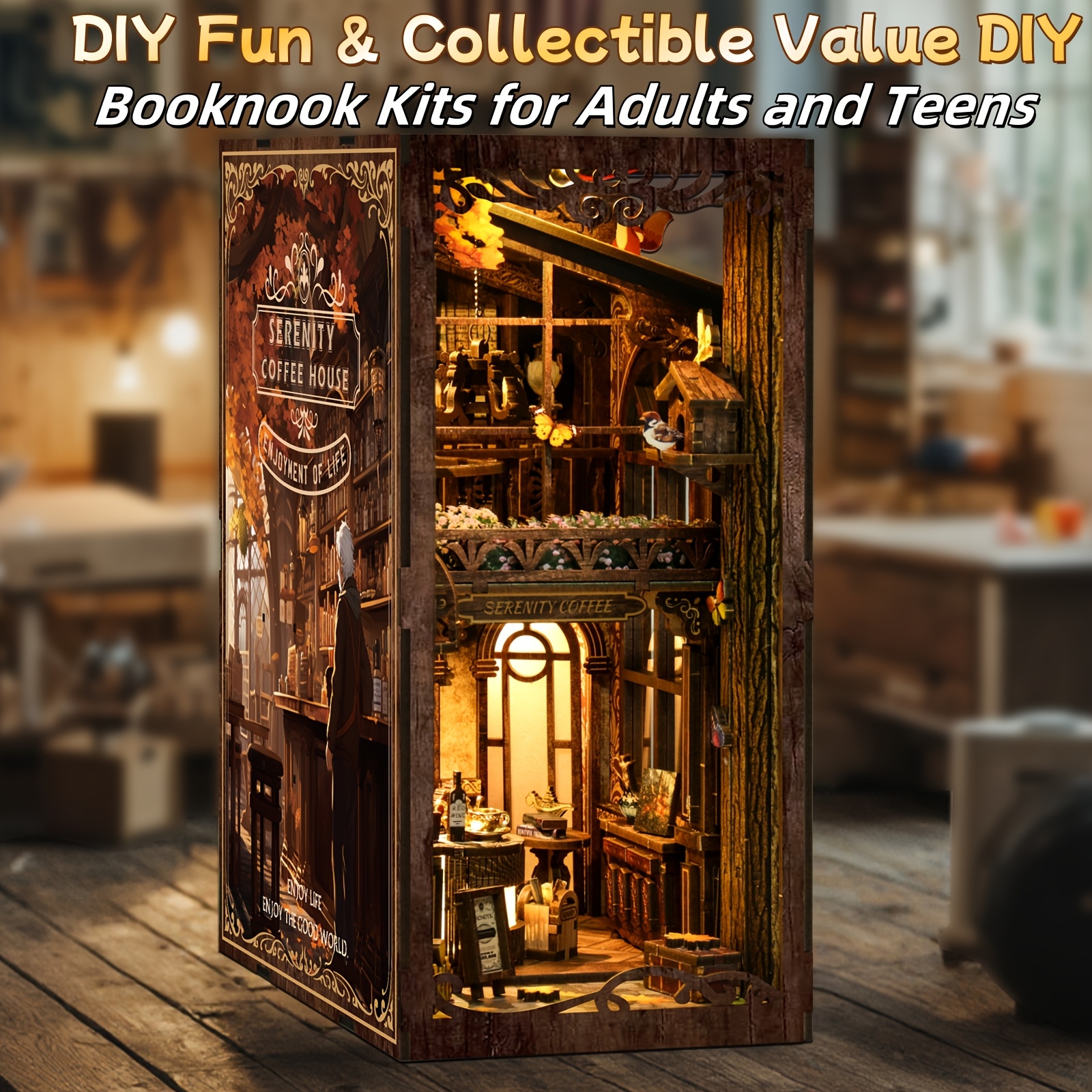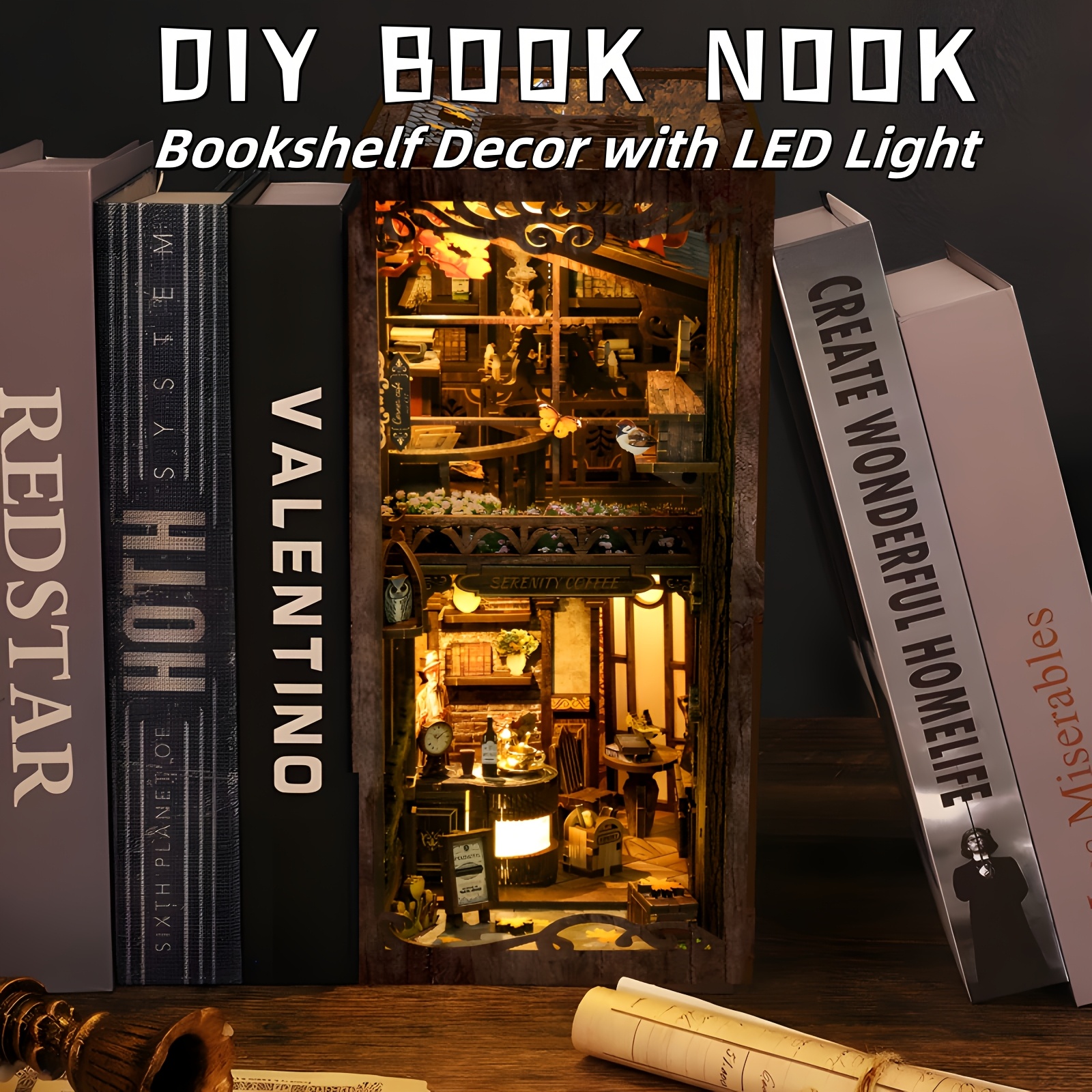 DIY Miniature Coffee House DIY 3D Wooden Bookshelf Puzzle with LED Light | Miniature Coffee House Book Nook Kit, Dustproof Decor for Adults & Teens ?C Perfect Gift for Craft Lovers